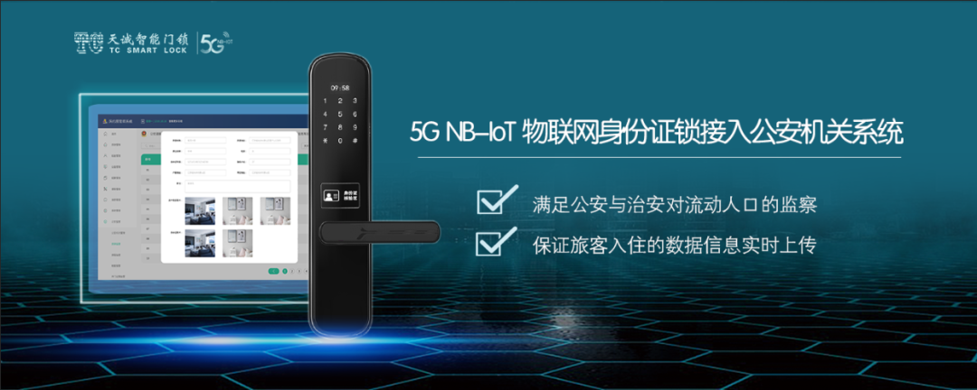 天诚5G NB-IOT身份验证物联网锁解决方案,将5G NB-IOT智能门锁、网约房平台系统、公安监管系统强强联手,进行可视化管理,实时掌握人员流动情况,为网约房、出租屋、民宿等安全保驾护航。